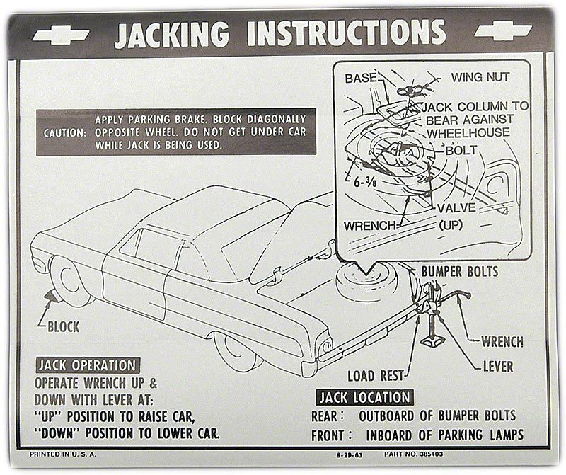 This Chevrolet reproduction jack stowage & jacking instructions sheet has been manufactured to original factory specifications using today's modern manufacturing techniques. You will find the quality and appearance will work superbly for your restoration. In addition, using a reproduction jack stowage & jacking instructions sheet from Eckler's will add authenticity and value to your Chevy.
