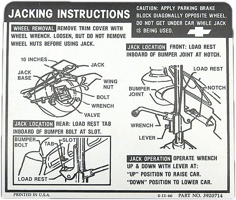This Chevrolet reproduction jack stowage & jacking instructions sheet has been manufactured to original factory specifications using today's modern manufacturing techniques. You will find the quality and appearance will work superbly for your restoration. In addition, using a reproduction jack stowage & jacking instructions sheet from Eckler's will add authenticity and value to your Chevy.
