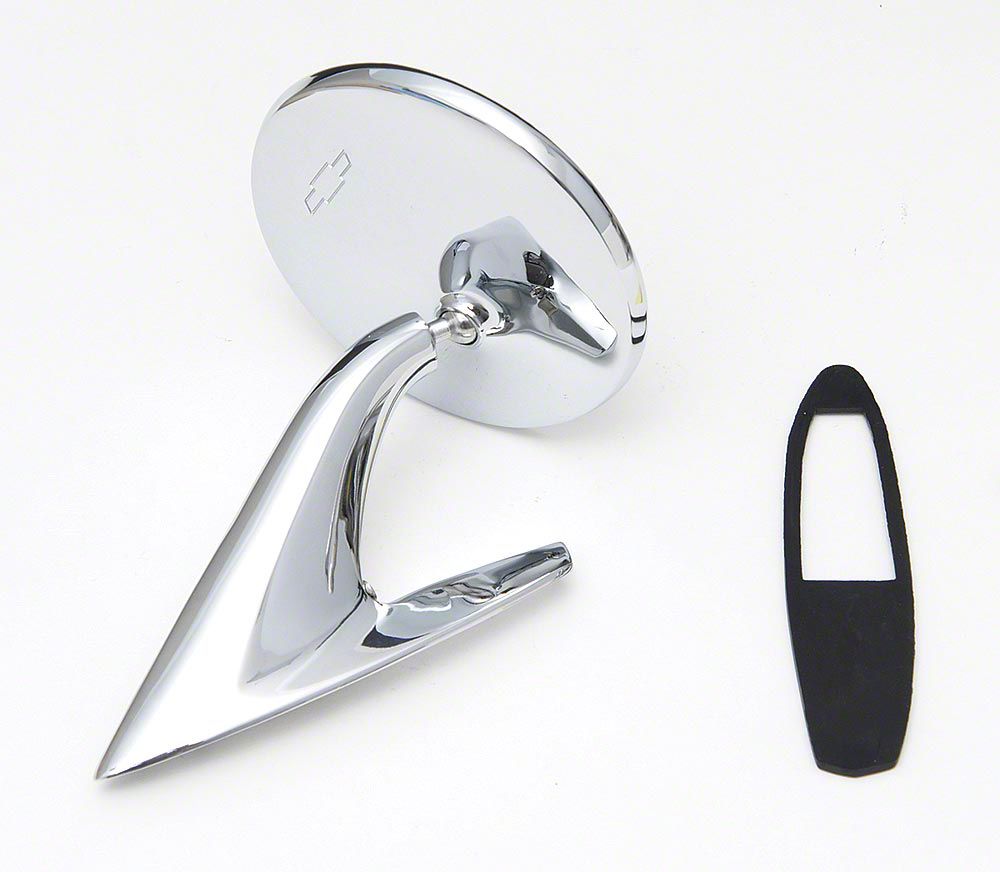 This is our best quality reproduction Chevy outside door rear view mirror. This Chevy mirror comes complete with bezel gasket and the mounting hardware to install it. It can be used as a single outside rear view mirror or mount one on the driver and passenger side for dual outside rear view mirrors on your Chevy. This high quality Chevy outside rear view mirror is perfect for your driver or high point show car. Our door rear view mirrors feature the correct "Chevy Bowtie" logo on the chrome back side. This rear view mirror adds both beauty and safety to your Chevy.