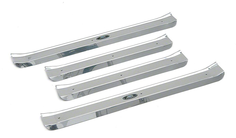 These Chevy sill plates are an exact reproduction of the embossed originals. They will fit all 4-door Chevys, any model. The original colored Body By Fisher name tags are already attached just as original. The chrome Phillips head attaching screws are included for easy, no fuss installation. Careful trimming of your carpet may be necessary to make the sill plates properly fit the floor contour. Be certain not to over-tighten the mounting screws, as the plates are made from stamped aluminum just like original. These Chevy sill plates are the best way to make your interior look brand new!