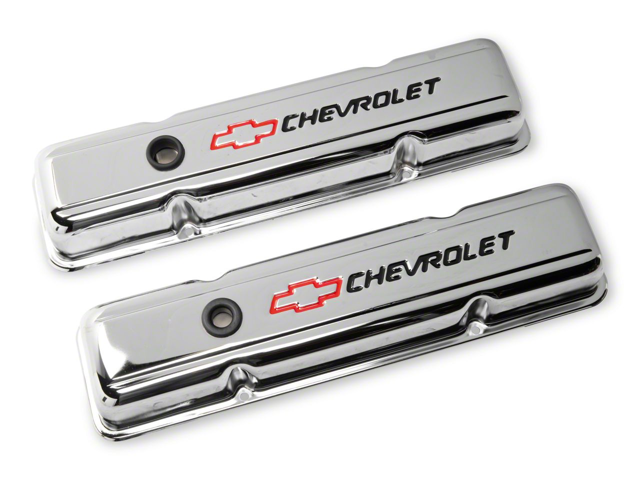 Full Size Chevy Valve Covers, Small Block, With Baffle, Short Design, Chrome, With Chevrolet Script & Bowtie Logo, 1958-1972