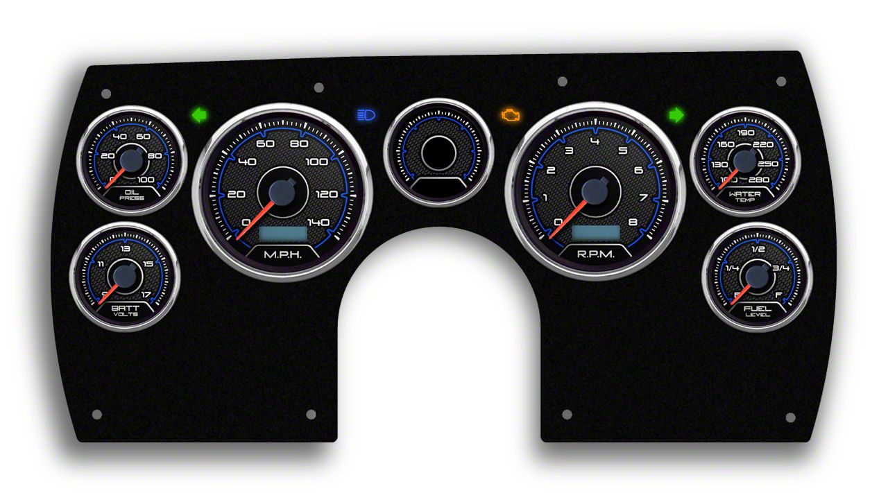 Kit also includes 3-3/8" speedometer, 3-3/8" tachometer, 2-1/16" voltmeter, water temperature, oil pressure and a factory match 0-90 ohm fuel gauge. Center blank gauge can be left in for appearance or upgraded to other matching NVU 2-1/16" instrument to round out the functions. Lower portion is blank and leaves plenty of room for customization: gauges, switches, warning lights; its up to you.