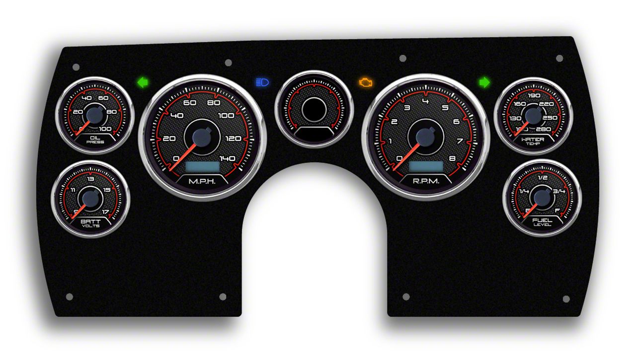 Kit also includes 3-3/8" speedometer, 3-3/8" tachometer, 2-1/16" voltmeter, water temperature, oil pressure and a factory match 0-90 ohm fuel gauge. Center blank gauge can be left in for appearance or upgraded to other matching NVU 2-1/16" instrument to round out the functions. Lower portion is blank and leaves plenty of room for customization: gauges, switches, warning lights; its up to you.