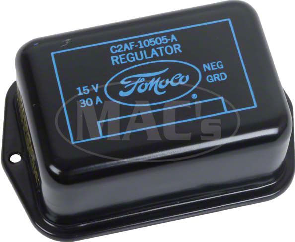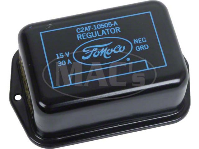 Save your original voltage regulator and replace that original tired outer cover. The original regulators were built tough by Ford. It is the cover that always show the wear. These covers are stamped like original and feature exact artwork and durable semi-gloss black power coated finish. The 25 amp version feature yellow lettering and the 30 amp version had a black and blue stamping. Used on 1962/1964 models of Ford, 6 cylinder cars without a/c. Made in the USA! For all of your classic Ford restoration needs, count on MAC's.