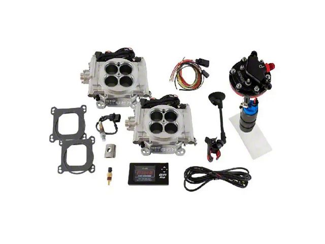Dual Quad EFI made simple with the Go EFI 2×4 625HP with bright aluminum finish self-tuning system combined with the HyperFuel™ Hy-Fuel Tight-Fit In-Tank Retrofit Kit. This kit is a bolt-on for the most popular manifolds including the Edelbrock line of dual quad manifolds without any adapters! They fit and look like they belong there because they were designed to fit from the start. Our normally aspirated kits are good thru 625hp but our Go EFI 2×4 Power Adder kit can handle you guys with the bigger cubes and roots superchargers. One throttle body handles all of the brains while the second holds four additional injectors and