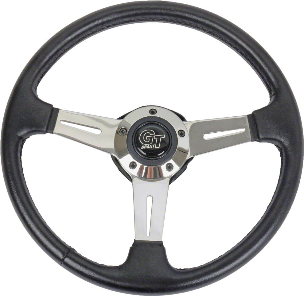 The Elite GT steering wheel features highly polished mirror finish aluminum spokes. The wheel is highlighted by a machined billet aluminum trim ring. These models feature a hand-stitched leather-grained vinyl grip. A Grant Installation Kit is necessary to mount this wheel to a vehicle.