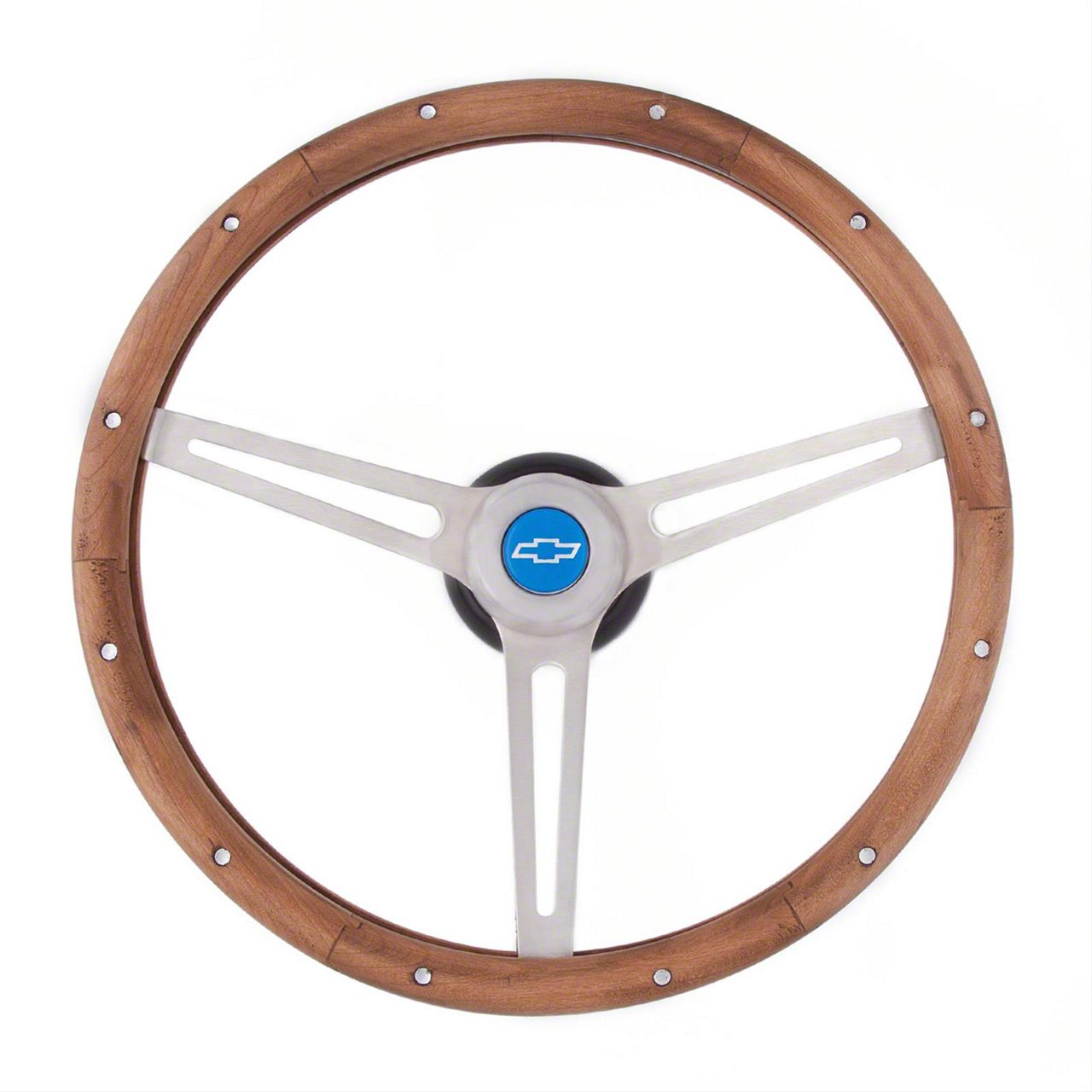 Classic Nostalgia GM Wheel. Genuine hardwood walnut finish grip with brushed stainless steel spokes, 3 spoke slotted design. 15" diameter