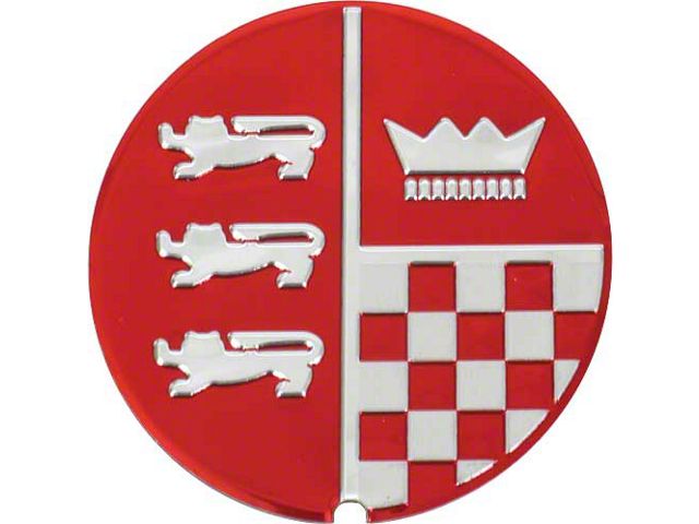 Featuring three chrome lions, a stylized crown and a checkerboard pattern on red background.