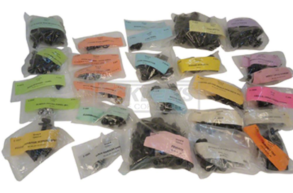(6) battery tray screws and U-nuts, (4) bumper filler panel (rear) screws, (8) bumper filler panels (rear) screws, (5) cowl panel screws, (4) door handle (outside) screws and nuts, (24) door hinge screws, (4) door latch striker screws, (6) door latches to door shell screws, (4) fender to radiator support brackets, screws, and J-nuts, (6) fender bracket screws and U-nuts, (8) fender splash shield bracket screws, nuts, and washers, (14) fender splash shield screws, (34) fender screws, J-nuts, and washers, (8) floorboard hole cover screws, (10) grille screws and nuts, (2) grille upper bracket (for Comet) screws, (16) headlamp door screws and nuts, (14) hood & hinge screws and J-nuts, (2) hood bumpers to cowl screws, (4) hood bumper