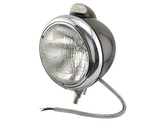 Guide light has clear lens which lights up amber with 5 LEDS, gloss black shell with chrome rim. A recreation of the sought-after Guide 682-C lamps for traditional Hot Rods. 7" diameter sealed beam.