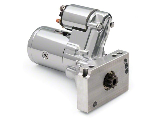 This high-torque, gear reduction design has a 12V, 2.4KW motor and a torque ratio of 15:1. Offset design results in more clearance between the oil pan and the starter, and can be rotated for additional chassis clearance in both 153 & 168 tooth flywheels. The high-torque, high-output motor spins the engine over faster than stock starters, delivering 40-50% more cranking power. 3.75-to-1 sealed gear-reduction drive and full ball bearing construction. Includes shims to set pinion-gear engagement (when necessary).