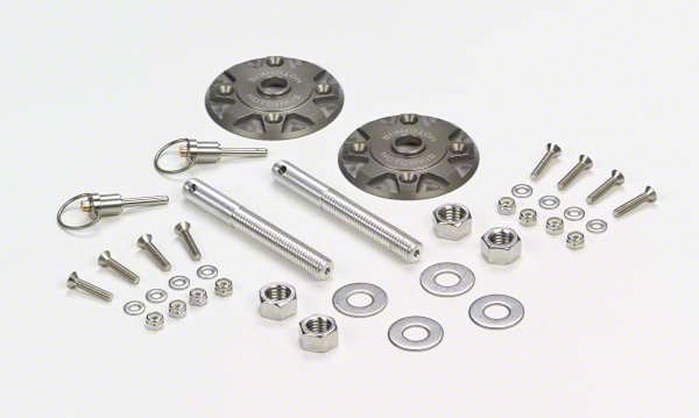 Replace those old, rusty chrome hood pins on your Nova with a pair of ultra trick, CNC machined aluminum hood pins from Hotchkis Sport Suspension. The hard annodized finish gives a high tech look to your car. The kit comes complete with aluminum pins, stainless hardware, hood pin plates, and an aluminum quick release pin. The universal design makes it a great update for any Nova.