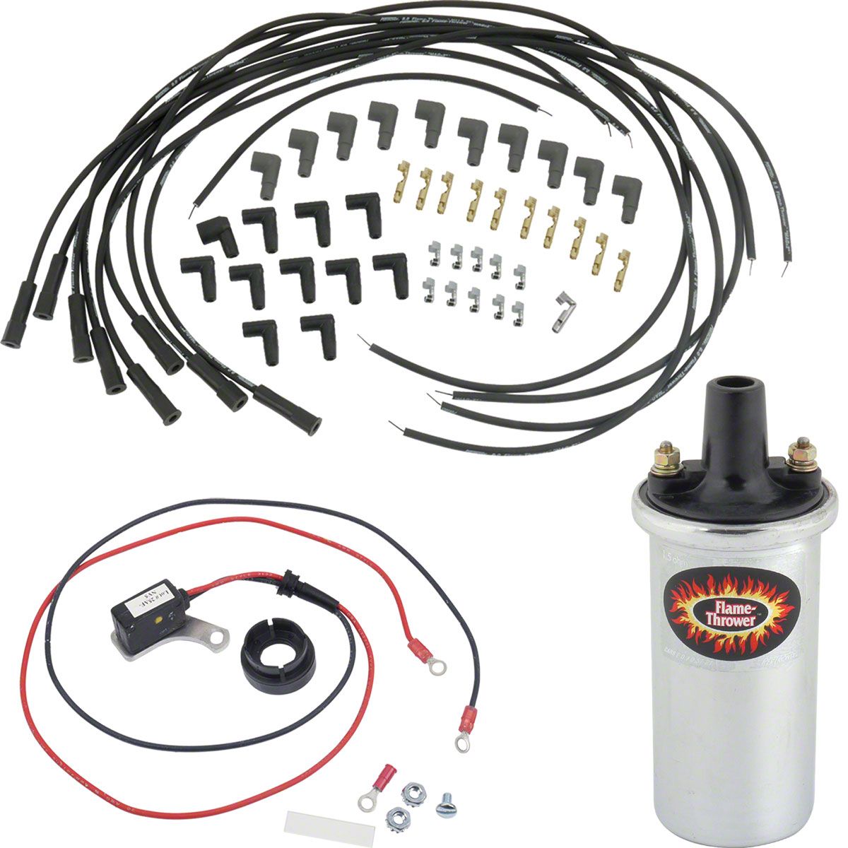 We now offer a complete kit of quality American made Pertronix Ignitor ignition products. Never change your points again! Get the Ignitor solid state ignition (to replace points), high performance Flame Thrower 8mm. spark plug wire set, and high performance Flame Thrower ignition coil in one cost cutting kit. Save time and money!