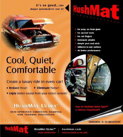 HushMat® specializes in reducing unwanted noise in your vehicle by eliminating structural vibration, reducing heat, road noise, engine noise, wind noise, engine exhaust, and radiant heat. You experience the quality sound and comfort of your automobile with HushMat®.