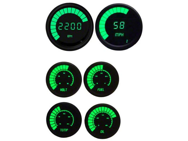 The Intellitronix Universal LED Bargraph Multi-Gauge set comes with 6 individual gauges, Speedometer, Tachometer, Voltmeter, Fuel, Oil Pressure & Water Temperature. Includes automatic night dimming along with a universal temperature sending unit (S8013), a universal oil pressure sending unit (S8434), a universal speedometer sending unit (S9013), and mounting hardware.