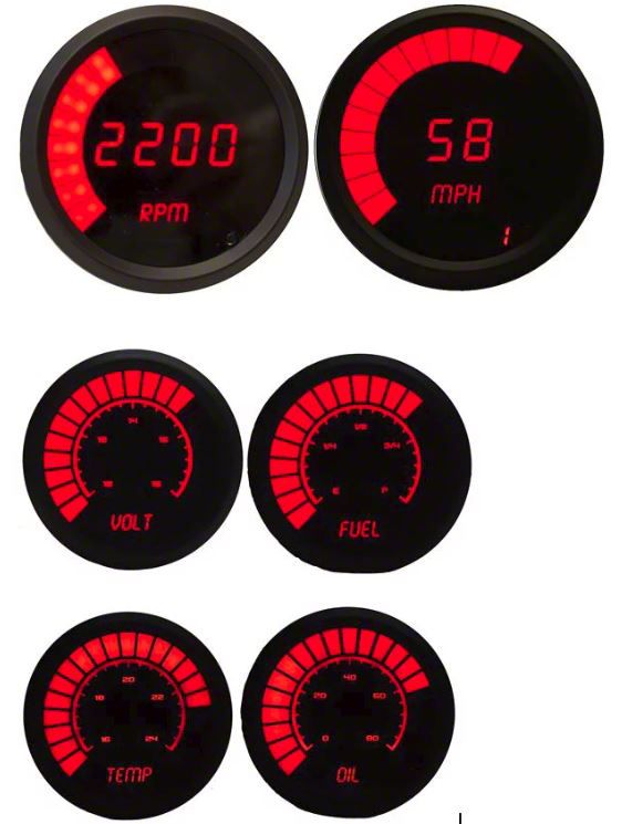 The Intellitronix Universal LED Bargraph Multi-Gauge set comes with 6 individual gauges: Speedometer, Tachometer, Voltmeter, Fuel, Oil Pressure & Water Temperature. Includes automatic night dimming along with a universal temperature sending unit (S8013); a universal oil pressure sending unit (S8434); a universal speedometer sending unit (S9013), and mounting hardware.