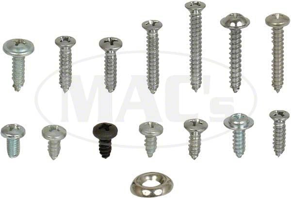 Complete kit of interior screws used on your classic. Brand new sets include all the screws used in the interior of your vehicle to include sill plates, interiot trim moldings, kick panels, seat hinge brackets. Our kits were made to save your valuable time. All in one bag with master list for each item included. Stop searching the garage floor for that old corroded hardware, we have it new!