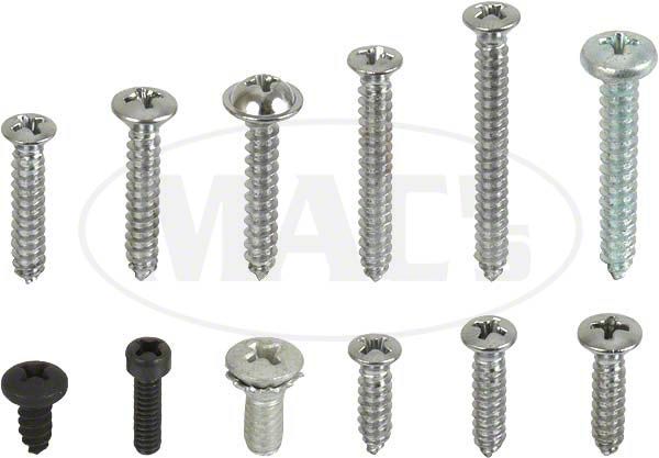 Complete kit of interior screws used on your classic. Brand new sets include all the screws used in the interior of your vehicle to include sill plates, interiot trim moldings, kick panels, seat hinge brackets. Our kits were made to save your valuable time. All in one bag with master list for each item included. Stop searching the garage floor for that old corroded hardware, we have it new!
