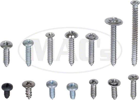 Complete kit of interior screws used on your classic. Brand new sets include all the screws used in the interior of your vehicle to include sill plates, interiot trim moldings, kick panels, seat hinge brackets. Our kits were made to save your valuable time. All in one bag with master list for each item included. Stop searching the garage floor for that old corroded hardware, we have it new!