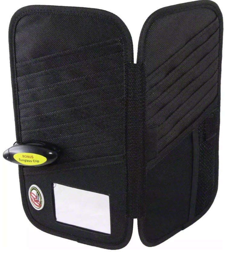 This visor organizer features an all-purpose pocket and has space to store 16 CD's or DVD's. It also has an integrated vanity mirror. Durable NY-Max material stands up to the toughest demands. It has an innovative product design and is built with durable high quality materials.