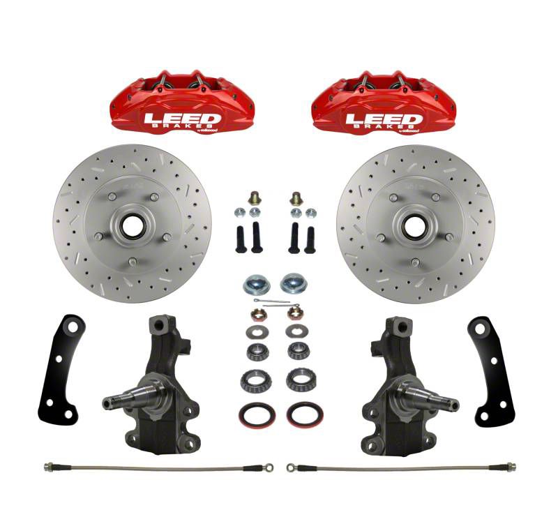 Add the safety, reliability and performance of disc brakes to your vehicle with our Max Grip Lite drum to disc brake conversion. In this kit you receive everything you need to mount red powder coated Max Grip 4 piston disc brakes and 2 inch drop spindles to the control arms of your vehicle. All components used in these kits are new high quality, precision machined products. Includes forged aluminum Max Grip Lite 4 piston calipers and Max Grip XDS cross drilled, slotted, and zinc plated rotors. Reduce brake fade and increase your braking performance with this modern easy to install disc brake concersion. Includes new 2 inch drop spindles.