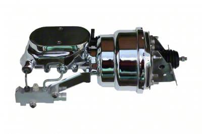 New 7" Dual Diaphragm chrome plated power brake booster, master cylinder & disc/disc proportioning valve combo. This 7" power booster is hand polished before a chrome finish is applied for a top quality finish. The top quality power brake booster is designed mount directly to your factory firewall. Also included in this kits is a new chrome 1-1/8" bore flat top master cylinder and proportioning valve equipped to work with 4 wheel disc brake applications.