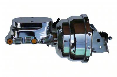 New 8" Dual Diaphragm chrome plated power brake booster, master cylinder & Adjustable Proportioning Valve combo. This 8" power booster is hand polished before a chrome finish is applied for a top quality finish. The top quality power brake booster is designed mount directly to your factory firewall. Also included in this kits is a new chrome 1-1/8" bore flat top master cylinder. Equipped to work with disc/drum and 4 wheel disc applications.