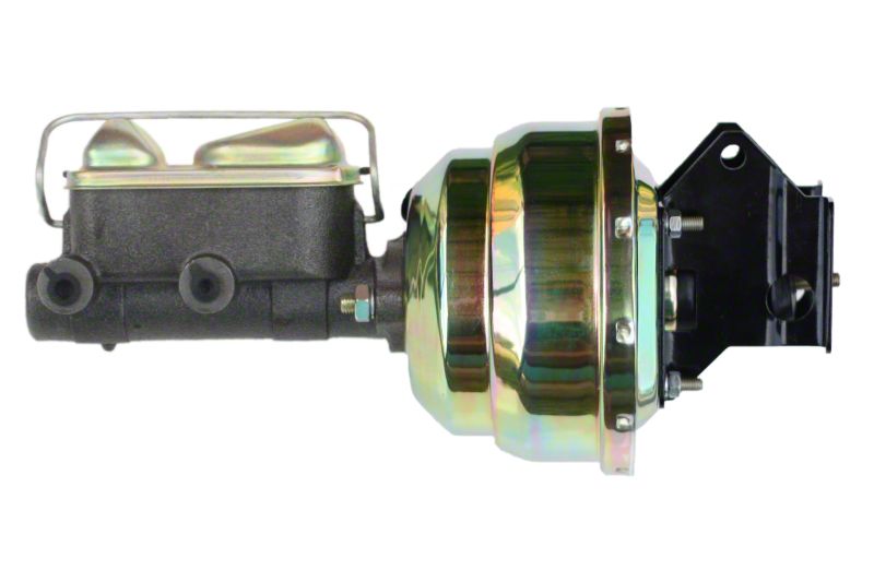 New 8" Dual Diaphragm zinc plated power brake booster kit. This 8" power booster is hand polished before a yellow zinc finish is applied for a top quality finish. The booster mounting brackets are a direct fit to your factory firewall. Also Included in this kit is a new 1" bore master cylinder perfect for most front disc /rear drum or 4 wheel disc brake applications. Note - Will not fit 1969-72 Factory Power Brake Cars.