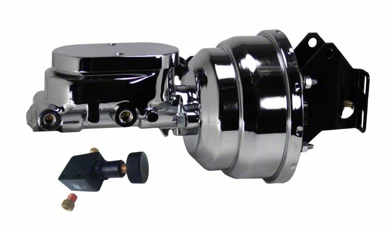 New 8" Dual Diaphragm chrome plated power brake booster kit. This 8" power booster is hand polished before a chrome finish is applied for a top quality finish. The booster mounting brackets are a direct fit to your factory firewall. Also Included in this kit is a new 1" bore master cylinder and adjustable valve perfect for most front disc /rear drum or 4 wheel disc brake applications. Note - Will not fit 1969-72 Factory Power Brake Cars.