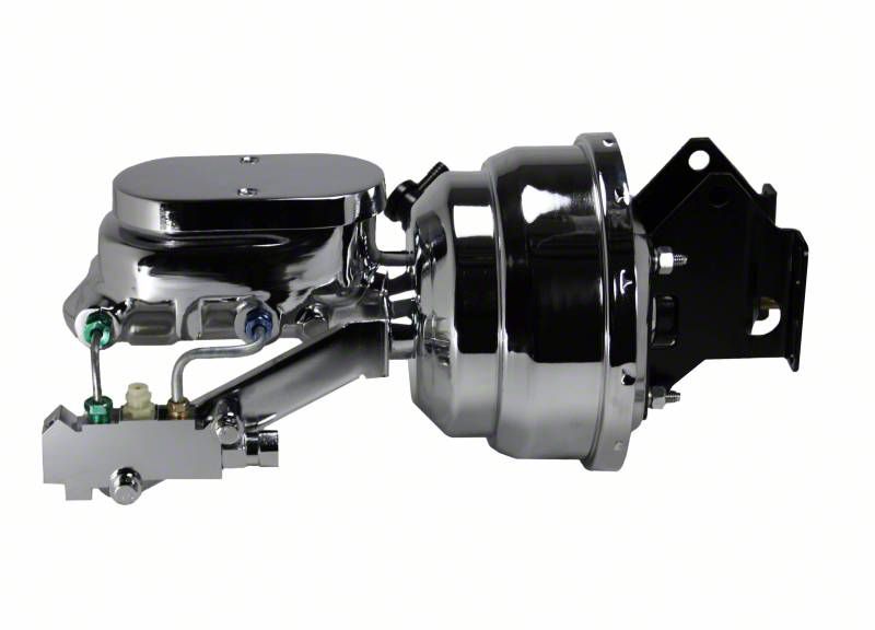 New 8" Dual Diaphragm chrome plated power brake booster kit. This 8" power booster is hand polished before a chrome finish is applied for a top quality finish. The booster mounting brackets are a direct fit to your factory firewall. Also Included in this kit is a new 1-1/8" bore master cylinder and proportioning valve perfect for most 4 wheel disc brake applications. Note - Will not fit 1969-72 Factory Power Brake Cars.