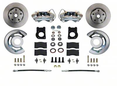 Add the safety, reliability and performance of disc brakes to your vehicle with our drum to disc brake conversion kit. In this drum to disc brake conversion kit, you receive everything you need to mount factory style 4 piston disc brakes to the original drum brake spindles currently on your vehicle. This drum to disc brake conversion kit is a direct bolt on with NO cutting, drilling or welding required. All components used in these disc brake hardware kits are new high quality, precision machined products. Complete this drum to disc brake conversion kit by adding one of our hydraulic kits or purchase a complete conversion kit. A great disc brake hardware kit with a factory look and easy installation for drum to disc brake conversion for Ford Mustangs! Note: Fits 64-69 V8 drum brake spindles. Also fits 67-69 6cyl spindles but converts the vehicle to 5 lug.