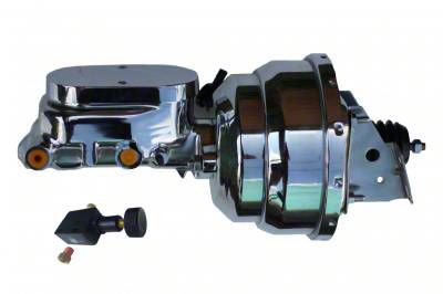 New 8" Dual Diaphragm chrome plated power brake booster, master cylinder & Adjustable Proportioning Valve combo. This 8" power booster is hand polished before a chrome finish is applied for a top quality finish. The top quality power brake booster is designed mount directly to your factory firewall. Also included in this kits is a new chrome 1-1/8" bore flat top master cylinder and Adjustable Proportioning Valve combo. equipped to work with disc/drum and 4 wheel disc applications.