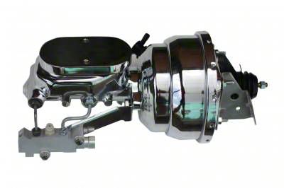 New 8" Dual Diaphragm chrome plated power brake booster, master cylinder & disc/drum proportioning valve combo. This 8" power booster is hand polished before a chrome finish is applied for a top quality finish. The top quality power brake booster is designed mount directly to your factory firewall. Also included in this kits is a new chrome 1-1/8" bore flat top master cylinder and proportioning valve equipped to work with front disc / rear drum applications.