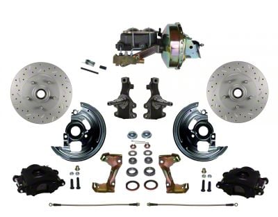 Check out this GM, A, F, X body, front disc brake conversion package for sale with black 9-inch powder coated calipers. This gives great looks, better safety, and high performance.