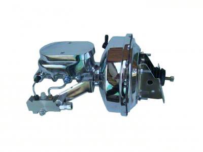 New 9" chrome plated power brake booster, Flat Top master cylinder & disc / Drum Proportioning Valve combo. This 9" power booster is hand polished before a chrome finish is applied for a top quality finish. The top quality power brake booster is designed mount directly to your factory firewall. Also included in this kits is a new Chrome aluminum 1-1/8" bore master cylinder and Proportioning Valve equipped to work with front disc / rear drum brake applications.