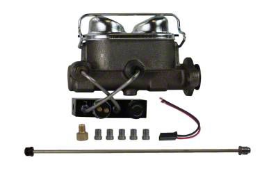 Upgrade your car to a 1 in. dual bore master cylinder with our quick install kit. This kit allows you to upgrade your factory single bowl manual brake car to dual bowl manual brakes in no time. In this kit you receive the brake line necessary to route from the new master cylinder to your factory distribution block. Additionally we include an adjustable combo. This adjustable valve allows you to fine tune the amount of pressure your rear brakes receive in order to prevent rear wheel lockup. For those cars that require a pressure switch to activate your tail lights, this combo block has one built in for an easy connection. A great kit with a factory look and easy installation! Designed for 4 wheel drum brake applications.