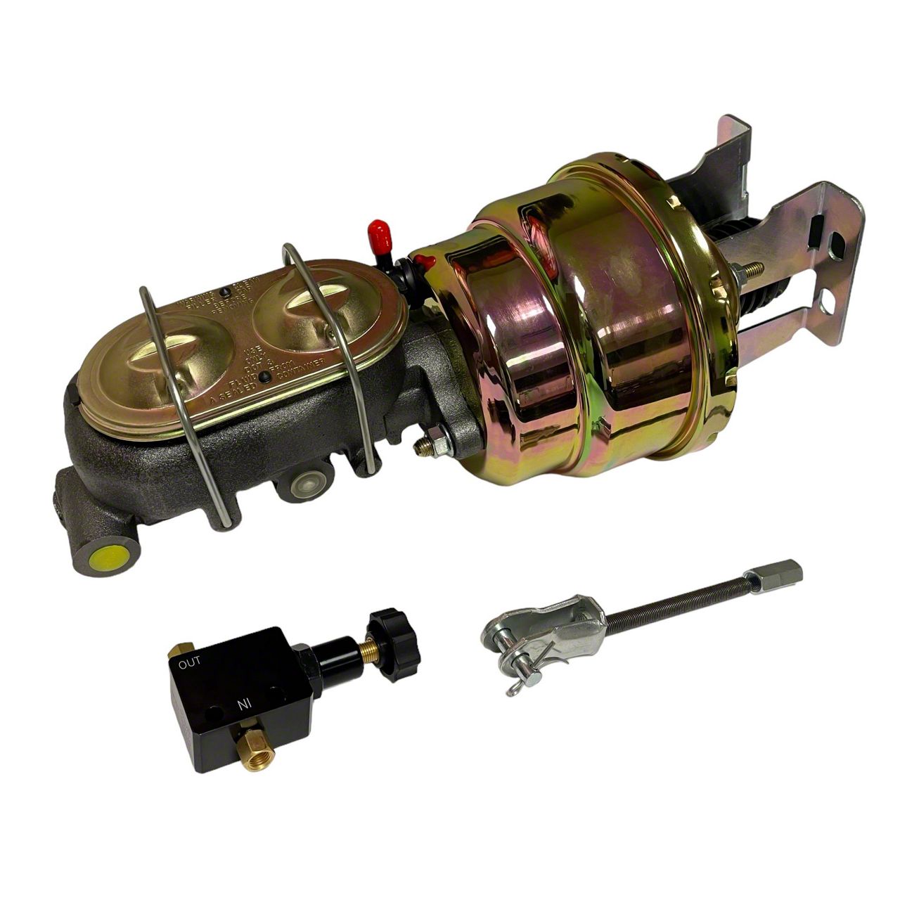 New 7" Dual Diaphragm zinc plated power brake booster, master cylinder & adjustable proportioning valve combo. This 7" power booster is hand polished before a yellow zinc finish is applied for a top quality finish. The top quality power brake booster is designed mount directly to your factory firewall. Also included in this kits is a new 1-1/8" bore master cylinder and proportioning valve equipped to work with front disc rear drum or 4 wheel disc applications.