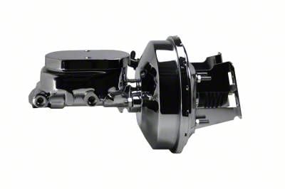 New 9" chrome plated power brake booster & master cylinder. This 9" power booster is hand polished before a chrome finish is applied for a top quality finish. The top quality power brake booster is designed mount directly to your factory firewall. Also included in this kits is a new chrome 1-1/8" bore flat top master cylinder equipped to work with front disc/ rear drum or 4 wheel disc brake applications.