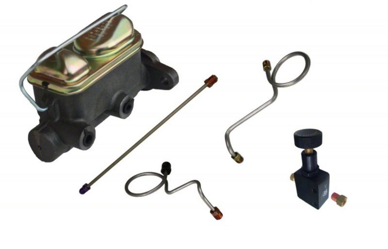 Upgrade your car to a 1 in. dual bore master cylinder with our quick install kit. This master cylinder upgrade kit allows you to upgrade your factory single bowl manual brake car to dual bowl manual brakes in no time. In this kit you receive the brake lines necessary to route from the new master cylinder to your factory 3 port distribution block. Additionally we include an adjustable valve which will be installed to your rear brake line with the hardware supplied. This adjustable valve allows you to fine tune the amount of pressure your rear Mustang manual brakes receive in order to prevent rear wheel lockup. A great kit with a factory look and easy installation that will work as a 1967 Mustang master cylinder replacement!