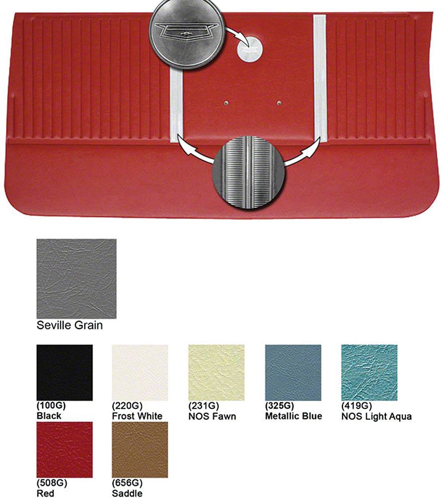 The Legendary door panels feature as original die-electrically heat sealed Seville grain vinyl and special cutout area in filler board to accommodate armrest base. Padded multi level construction, 3 dimentional panel. Also featured is the heat sealed chrome Chevrolet bowtie emblem and correct accent as original. Do settle for good when you can get the best available in these Legendary interior parts.