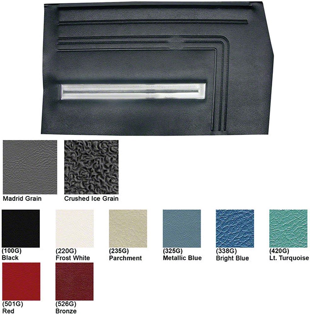 The Legendary quarter trim panels feature as original die-electrically heat sealed Madrid grain vinyl with fine pebble grain chrome accent & Crushed Ice grain lower section, and special cutout area in filler board to accommodate armrest base. Padded multi level construction, 3 dimentional panel. Do not settle for good when you can get the best available in these Legendary interior parts
