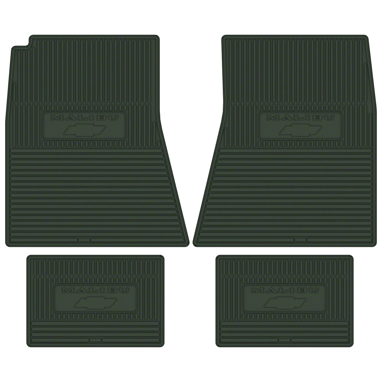 The floor mats in your 1969 1970 1971 1972 Malibu can take a lot of abuse over the years. From rain, snow, or mud, your feet can bring in all kinds of elements to make your interior appear dingy. Worn down, ugly floor mats can ruin the inside appearance of your classic Malibu. Eckler's Chevelle would like to enhance the vintage look of your Malibu interior with these great looking, restoration correct rubber floor mats from Legendary Auto Interiors. Every four piece set features officially licensed, molded-in logos on each mat. These mats will exactly replace your original mats and come with anti-skid backing to keep them securely in place during driving. These custom rubber floor mats from Legendary Auto Interiors will make the interior of your Malibu look good as new. From racers, show c