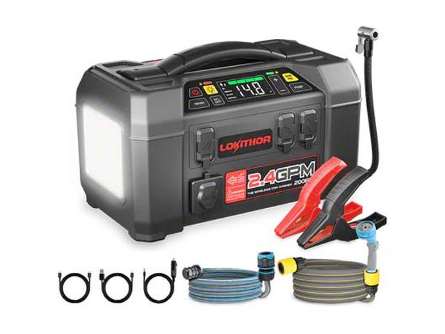 Versatile Emergency Power Tool. The LOKITHOR 5-in-1 Jump Starter with Pressure Washer Air Compressor is a powerful multi-functional tool designed for vehicle emergencies and maintenance. With a 2500 amp jump starter, it ensures reliable engine starts, while the built-in air compressor can quickly inflate tires. The integrated pressure washer allows for light cleaning tasks, making it an essential companion for drivers and adventurers alike.