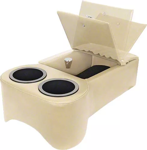 Specifically designed to sit on the transmission hump, it has two bendable aluminum plates that act as legs to help keep it in place. Like our seat consoles, this, too, is upholstered in long-wearing, automotive-grade vinyl with double-stitched French seams. It features two king sized drink holders and a large storage compartment with a hinged lid. That hinged lid has a convenient storage pouch sewn onto it to hold your sunglasses, cell phone, or a map or two. With twelve colors to choose from, you can certainly find one that will complement your interior.