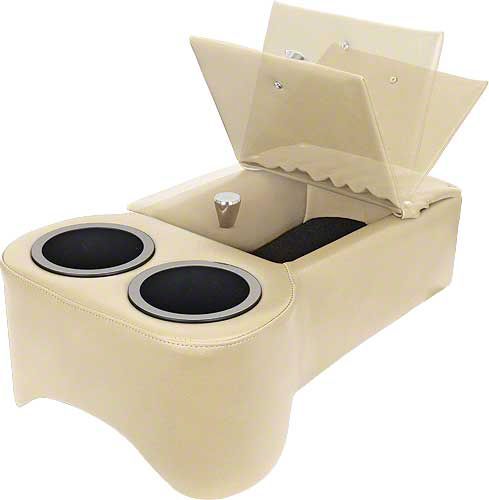 For those of you who don't want a console sharing the front seat with you, we'd like to introduce our new Low-Rider Floor Console. Specifically designed to sit on the transmission hump, it has two bendable aluminum plates that act as legs to help keep it in place. Like our seat consoles, this, too, is upholstered in long-wearing, automotive-grade vinyl with double-stitched French seams. It features two king-sized drink holders & a large storage compartment with a hinged lid. That hinged lid has a convenient storage pouch sewn onto it to hold your sunglasses, cell phone, or a map or two. With a choice of 12 beautiful colors, you can certainly find one that will complement your interior.