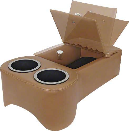 Specifically designed to sit on the transmission hump, it has two bendable aluminum plates that act as legs to help keep it in place. Like our seat consoles, this, too, is upholstered in long-wearing, automotive-grade vinyl with double-stitched French seams. It features two king sized drink holders and a large storage compartment with a hinged lid. That hinged lid has a convenient storage pouch sewn onto it to hold your sunglasses, cell phone, or a map or two. With twelve colors to choose from, you can certainly find one that will complement your interior.
