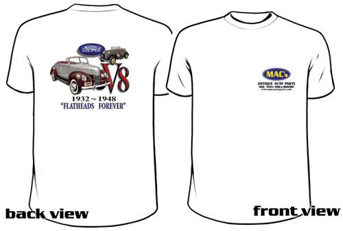 White shirt with Ford logo, 2 convertibles, and phrase "Flatheads Forever".