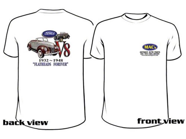 White shirt with Ford logo, 2 convertibles, and phrase "Flatheads Forever".