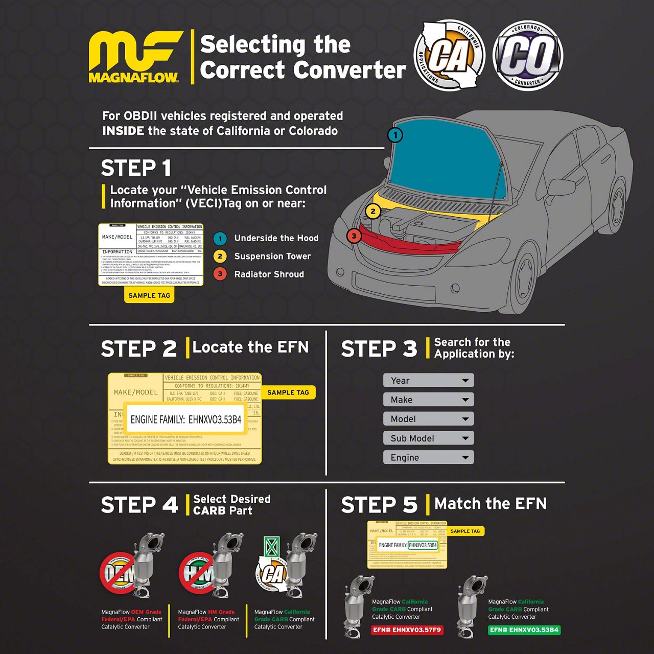 MagnaFlow California Grade CARB Compliant Universal Catalytic Converter 3322019 helps keep the check engine light off. Get the right fit for a wide array of vehicles thanks to the adaptable Universal design (cutting and welding is required). With highly corrosion resistant, stainless steel construction, you can have confidence in the quality of this catalytic converter. This replacement part is designed to meet or exceed California Air Resource Board requirements, and has undergone additional testing to comply with CARB guidelines to allow for legal use in California and CARB restricted states, for the listed vehicles.