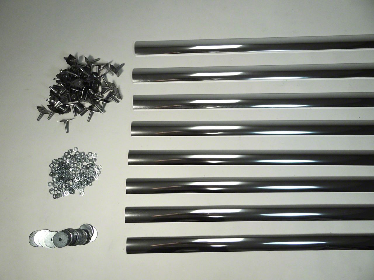 These strips use a completely hidden fastening system developed by MAR-K. Special bolts slide into the groove on the underside of the strip to adjust to any bolt location. These strips are buffed bright before anodizing and are precut to correct length for your truck. Bed strips include the correct number of (1 1/4") hidden fasteners for your truck. You may wish to purchase a bolt kit for bed-to-frame and side mounting. This truck requires 8 bed strips. Made in Oklahoma City, USA.